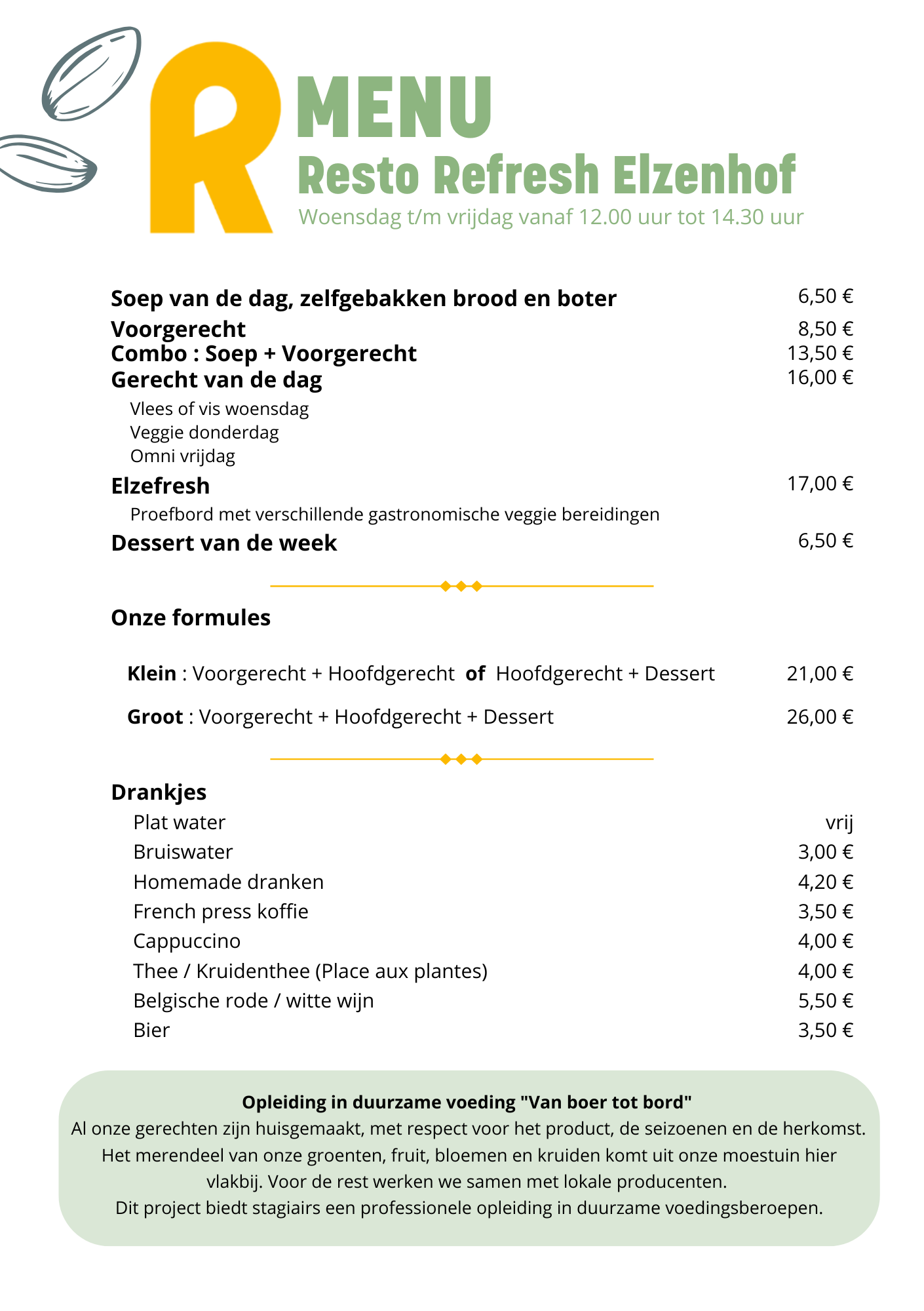 Installés dans le superbe bâtiment du GC Elzenhof, nous proposons un lunch à base des légumes, fruits et herbes aromatiques que nous cultivons à 300m du resto, et ce, 3 midis par semaine ! Plus frais et local, impossible!